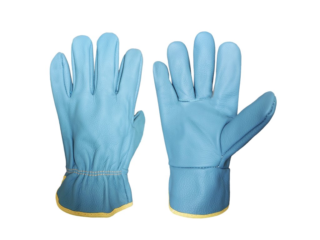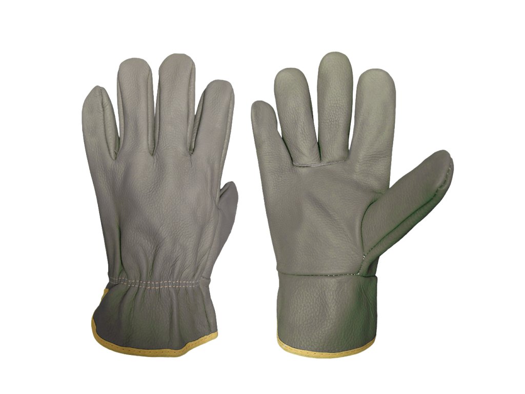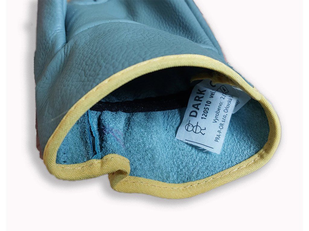 ochranné rukavice celokožené z tmavé nábytkové hověziny, bez podšívky, s pružinkou v zápěstí